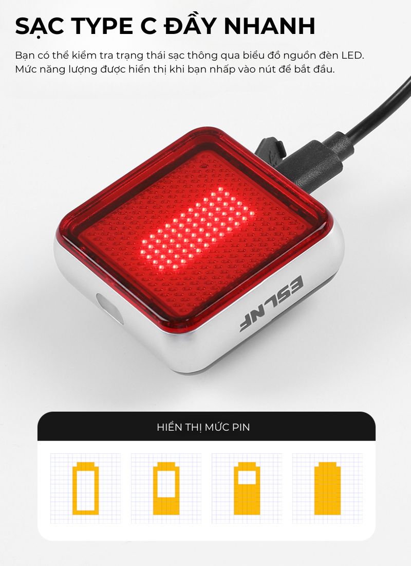 Đèn hậu cảm b iến xe đạp 8 chế độ ESLNF hỗ trợ sạc qua cổng Type-C đầy nhanh. Bạn có thể dễ dàng kiểm tra trạng thái sạc thông qua biểu đồ đèn LED, hiển thị mức năng lượng hiện tại khi nhấn nút.