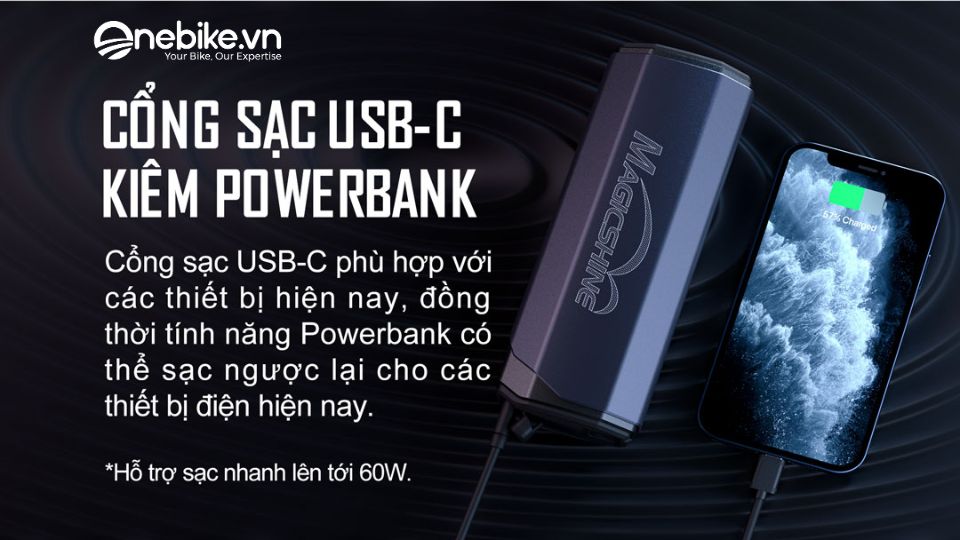 Đèn pha xe đạp siêu sáng MAGICSHINE MONTEER 12000 đi kèm với pack pin Li-ion rời dung lượng 14.4V 10,000mAh (144Wh), cho phép thời gian sử dụng lên tới 85 giờ ở chế độ ECO. Pin hỗ trợ sạc nhanh và còn có thể sử dụng như một Power Bank chuẩn USB-C PD 60W để sạc các thiết bị di động khác.
