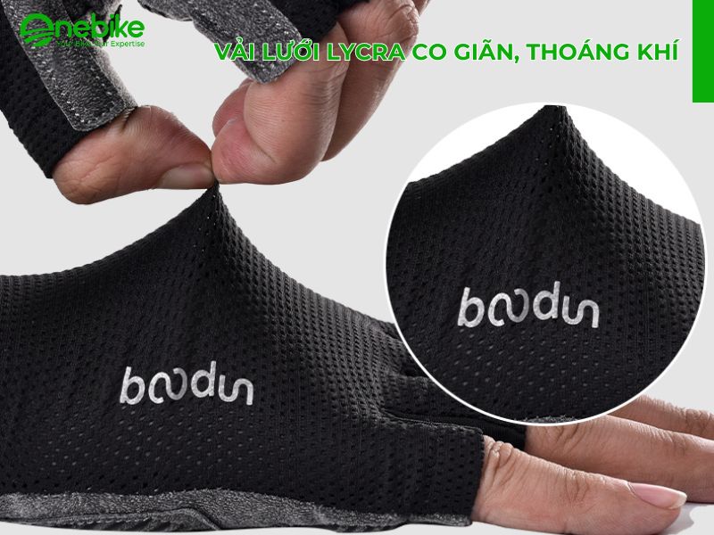 Găng tay xe đạp BOODUN được làm từ vải thun Lycra Cotton, kết hợp giữa sợi Cotton và sợi Lycra. Loại vải này nổi bật với khả năng hút ẩm tốt, giúp giữ cho đôi tay bạn luôn khô ráo trong những ngày nắng nóng. Thêm vào đó, găng tay không bị nhăn và mang lại tính thẩm mỹ cao, giúp bạn luôn trông thật thời trang khi đạp xe.