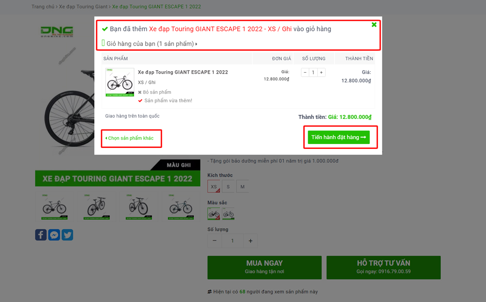 Chọn MUA NGAY để đưa sản phẩm vào giỏ hàng. Khi bạn bấm MUA NGAY sẽ hiện lên cửa sổ thông báo "Sản phẩm đã được đưa vào giỏ hàng"