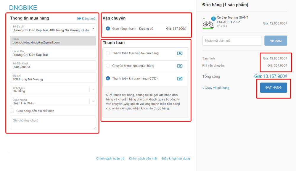 Sau khi chọn xong hình thức thanh toán bạn nhấn nút ĐẶT HÀNG để hoàn thành.
