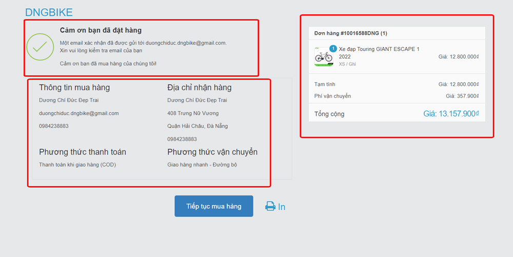 Sau khi xác nhận đặt hàng, bạn sẽ nhận được Email thông báo đơn hàng đã đặt thành công từ Dngbike. Hãy lưu lại mã đơn hàng để bộ phận CSKH của chúng tôi có thể giải quyết các thắc mắc cho bạn trong trường hợp cần thiết.