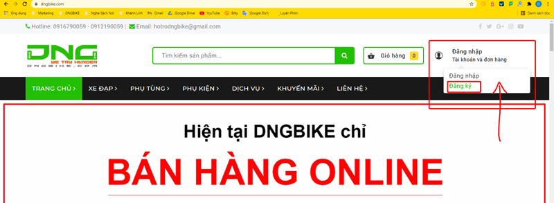 Quý khách truy cập vào trang chủ Dngbike.com nhìn sang góc phía trên bên phải, nhấp vào chọn "Đăng ký tài khoản" nếu quý khách chưa có tài khoản, nhấp chọn "Đăng nhập" nếu quý khách đã có tài khoản tại DNGBIKE