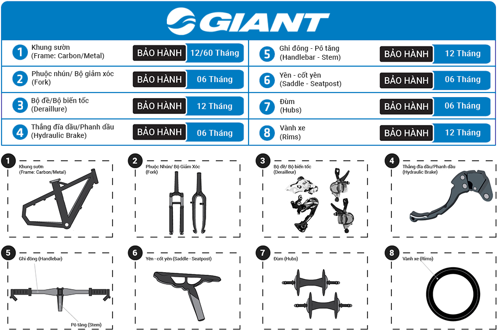 Công ty Giant cung cấp Chính sách bảo hành này để đảm bảo sửa chữa miễn phí theo các điều khoản và điều kiện trên đây. Đối với những vấn đề xảy ra sau thời gian bảo hành, việc đảm bảo này không được áp dụng.