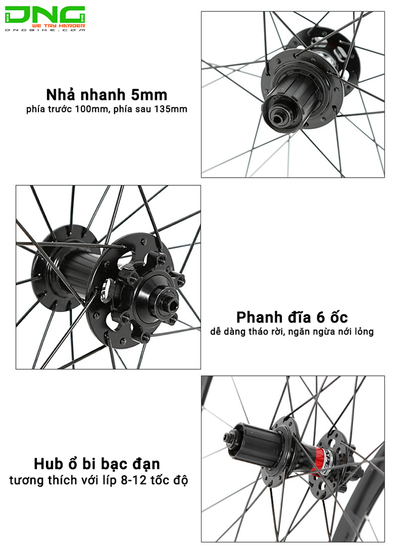 Vành sử dụng moay ơ (Hub) ổ bi bạc đạn, chất liệu carbon siêu nhẹ, cối nổ, giúp giảm trọng lượng của xe và tăng hiệu suất khi di chuyển. Vành tương thích với các loại lốp 700x23-40C và sử dụng cối líp 8, 9, 10, 11; hub trước & hub sau 24 lỗ nan hoa.