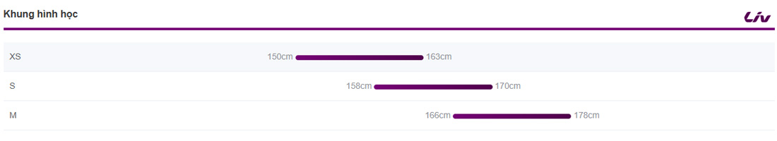 Bảng thông số khung và thông số kích thước SIZE Xe đạp LIV TEMPT 2 2025: SIZE XS (Phù hợp với chiều cao 1m50-1m63), SIZE S (Phù hợp với chiều cao 1m58-1m70), SIZE M (Phù hợp với chiều cao 1m66-1m78).