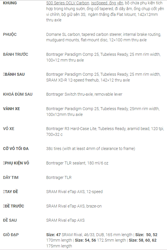 BẢNG THÔNG SỐ KĨ THUẬT XE ĐẠP TREK DOMANE SL 6 ETAP 2023 GEN 4
