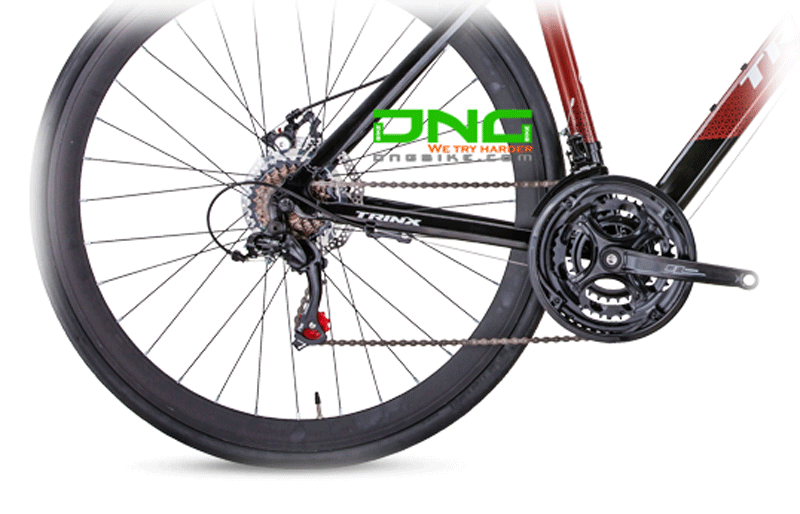 Khung xe được làm từ hợp kim Nhôm TRINX Alloy chắc chắn, có khả năng chịu va đập tốt và có kích thước 700cc*46cm phù hợp với những người có chiều cao từ 1m55 đến 1m80. Thiết kế của khung xe tạo cảm giác mạnh mẽ, mang phong cách rất chuyên nghiệp nhưng không kém phần năng động.