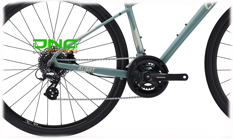 Xe đạp Liv Alight 2 DD D 2022 sử dụng bộ truyền động shimano của Nhật: sang đĩa Shimano Tourney, củ đề Shimano Altus 8S, líp Shimano CS-HG318, 11x34, xích KMC X8.3, giò dĩa Shimano TY-501, 30/46.