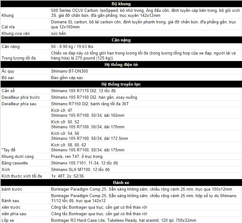 BẢNG THÔNG SỐ XE ĐẠP TREK DOMANE SL 6 GEN4