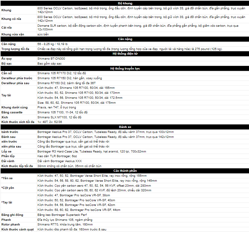 BẢNG THÔNG SỐ XE ĐẠP TREK DOMANE SLR 6 GEN4
