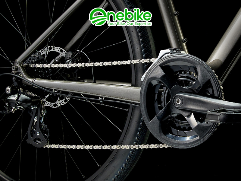 TREK Dual Sport 1 trang bị bộ truyền động Shimano 16 tốc độ của Nhật: Đề trước Shimano Tourney TY710, đề sau Shimano Altus M310, giò dĩa Forged alloy, ổ líp Shimano HG31, 11-32, 8-speed, sên xe KMC Z8.3.4.