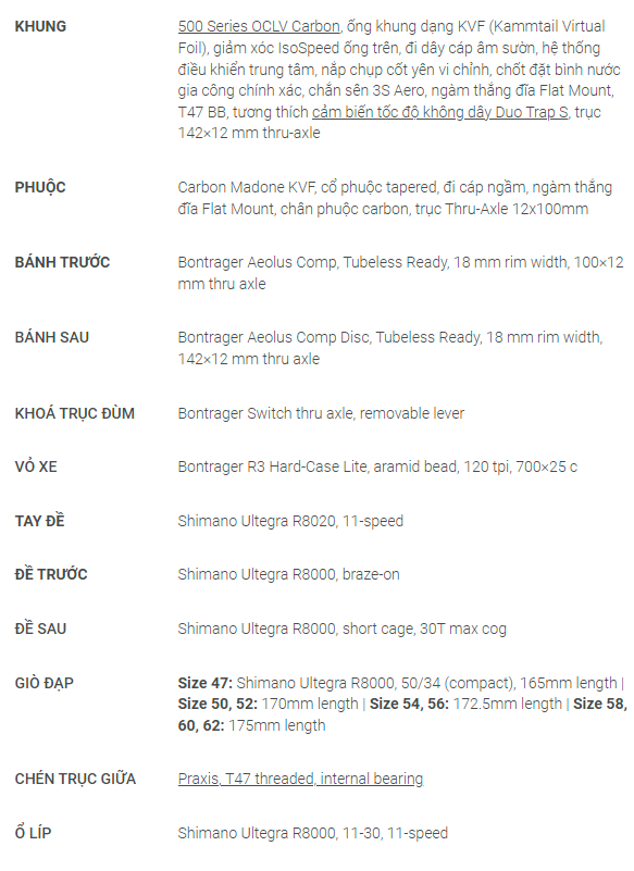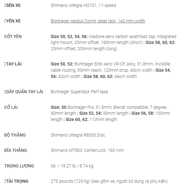 BẢNG THÔNG SỐ XE ĐẠP TREK MADONE SL 6 DISC