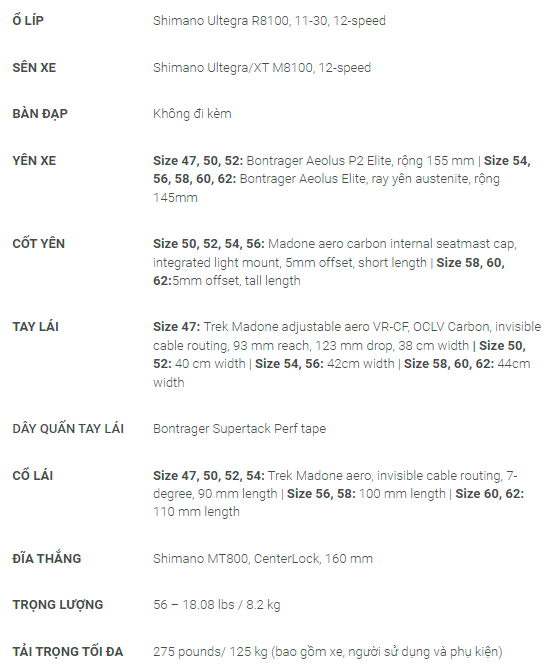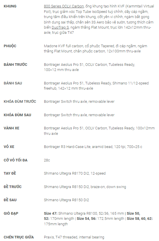 BẢNG THÔNG SỐ KĨ THUẬT XE ĐẠP TREK MADONE SLR 7 GEN 6 2023