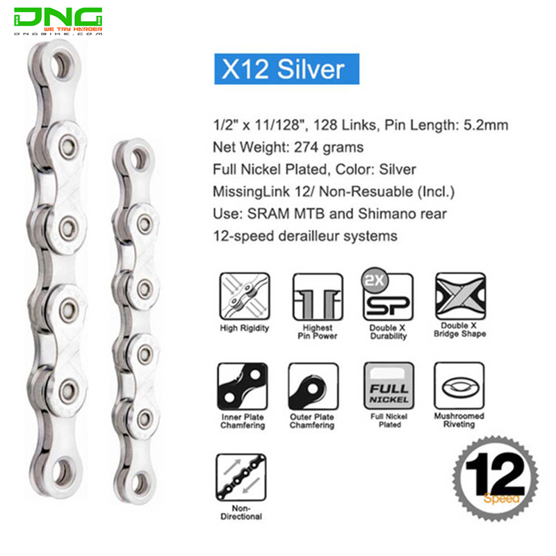 Xích xe đạp KMC X12 126L Fullbox sử dụng công nghệ X cầu, đặt biệt thiết kế tấm ADS trong êm ái, nhanh chống, dịch chuyển chính xác. Ngoài ra, Xích mạ niken giúp bảo vệ các tác động môi trường, chống mòn.
