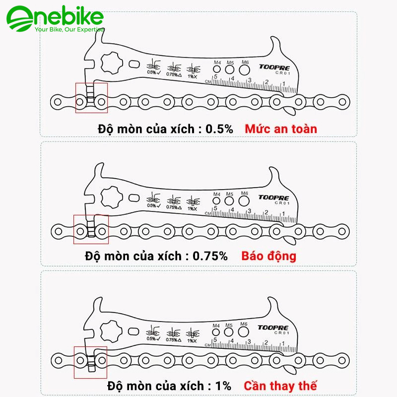 Trung bình xe đạp sau khi di chuyển khoảng 3000km thì mọi người được khuyến cáo là nên thay xích, tuy nhiên còn vô số lí do khác dẫn đến dây xích bị hỏng như địa hình, trọng lượng người đạp, bảo dưỡng định kỳ như thế nào...Tốt nhất chúng ta nên kiểm tra bằng dụng cụ đo xích, bảo dưỡng xích thường xuyên để theo dõi tuổi thọ của dây xích.