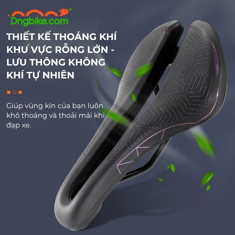 Với lỗ rỗng thông khí lớn ở trung tâm, yên xe tạo luồng không khí lưu thông tự nhiên, giảm nhiệt và hạn chế ma sát khi vận động mạnh. Giúp vùng tiếp xúc luôn khô thoáng, không gây bí nóng trong điều kiện thời tiết oi bức.