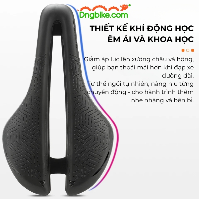 Yên được thiết kế dựa trên cấu trúc cơ thể người, giúp phân bổ áp lực hợp lý lên vùng xương chậu và hông, giảm đau mỏi hiệu quả khi đạp xe đường dài. Dáng khí động học giúp người dùng duy trì tư thế thoải mái và tối ưu lực đạp trong suốt hành trình.